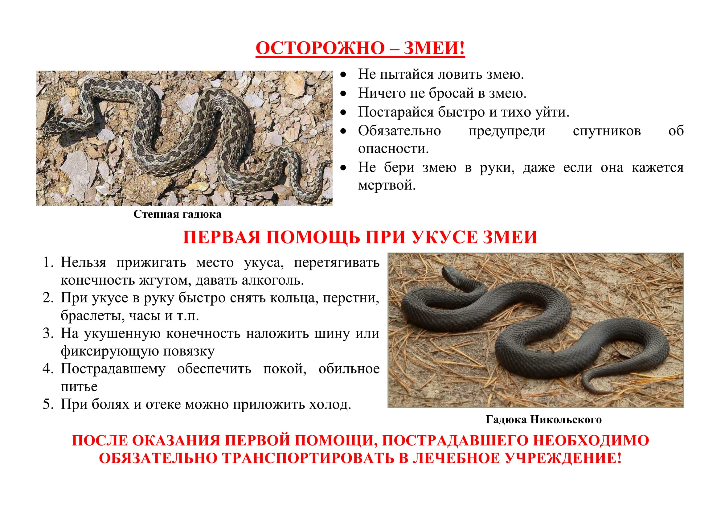 Что может подстерегать в лесу? Кроме ядовитых грибов и ягод, которые нужно знать и не трогать? Существует опасность укуса змеями и клещами. При походе в лес всегда нужно тщательно подбирать одежду, чтобы обезопасить себя, а при возвращении обязательно провести осмотр одежды и тела. При любых укусах немедленно обращайтесь в медицинские учреждения!