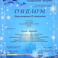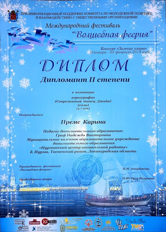 С 31 января по 3 февраля в Санкт-Петербурге в рамках Международного фестиваля «Волшебная феерия» проходил конкурс «Зимние узоры». Премс Карина, воспитанница педагога дополнительного образования Граф Надежды Викторовны, стала дипломантом II степени в номинации «Хореография» (современный танец — джайв) в возрастной категории 5-7 лет.